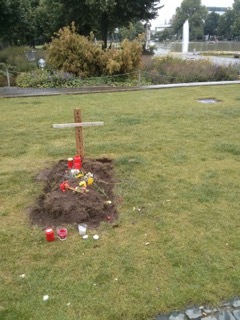 In der vergangenen Nacht wurde auch in Stuttgart ein Grab für die an den EU-Außengrenzen ermordeten Flüchtlinge symbolisch errichtet. Wahrscheinlich nimmt die Aktion Bezug auf die Gruppe „Zentrum für politische Schönheit“, die in Berlin kürzlich Flüchtlinge, die im Mittelmeer ertrunken sind, beerdigt hat. Am Sonntag demonstrierten mehrere Tausend Menschen vor dem Bundestag für eine menschliche Asylpolitik, legale Einreisewege in die EU und gegen den Massenmord an den EU Außengrenzen. Dabei wurden symbolisch Gräber ausgehoben.