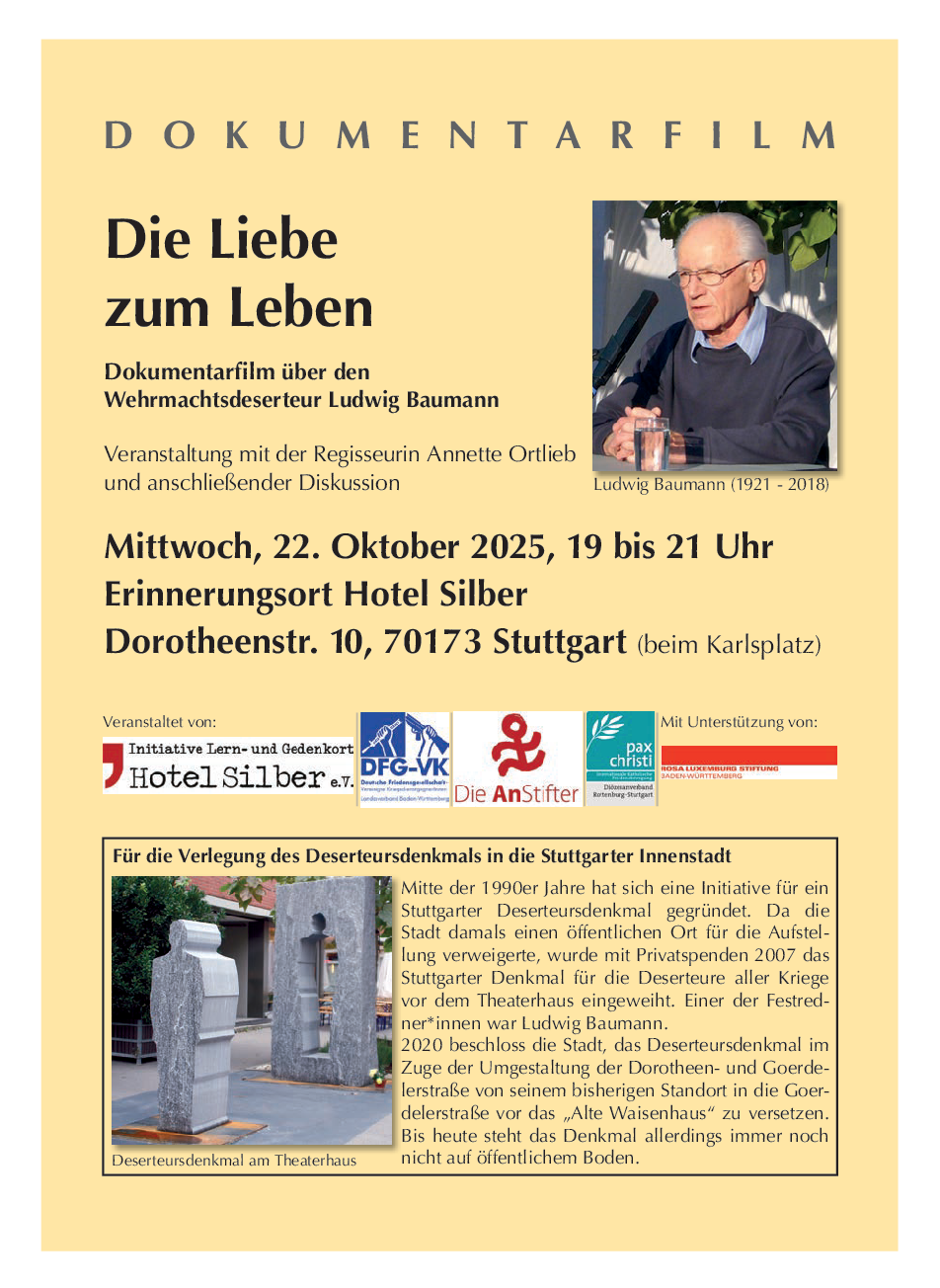 Annette Ortlieb widmet sich in ihrem Dokumentarfilm DIE LIEBE ZUM LEBEN einem Thema, das in der Aufarbeitung der jüngeren deutschen Vergangenheit bisher kaum beleuchtet wurde. Dabei stehen die Lebensgeschichte und das Schicksal des ehemaligen Soldaten Ludwig Baumann (1921-2018) beispielhaft für die ca. 3 000 bis 4 000 Menschen, die zwar das gegen sie verhängte Todesurteil als Deserteur überlebten, es aber ihr Leben lang mit sich herumtragen mussten, ohne dass sich jemand – auch nicht der Rechtsstaat der Bundesrepublik Deutschland – für die Aufhebung der Urteile oder deren Aufhebung eingesetzt hat.